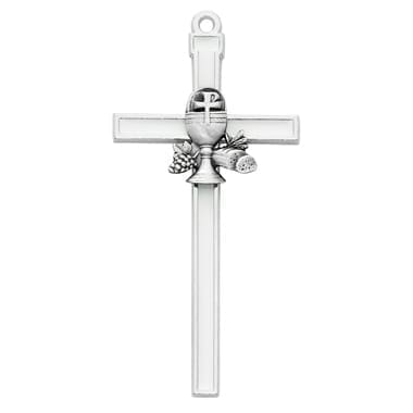 5 1/2" CHALICE WALL CROSS WITH SILVER TRIM AND WHITE ENAMEL. MADE IN THE USA. BOX INCLUDED.