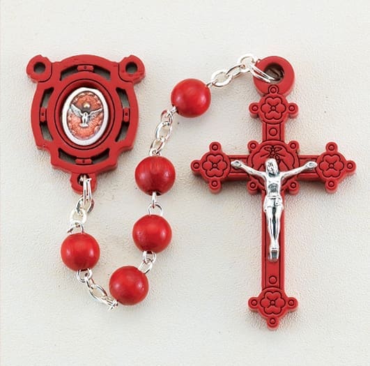 6mm Red Wood Bead Confirmation Rosary with Laser Cut Wooden Crucifix and Holy Spirit Center. 17 3/4"