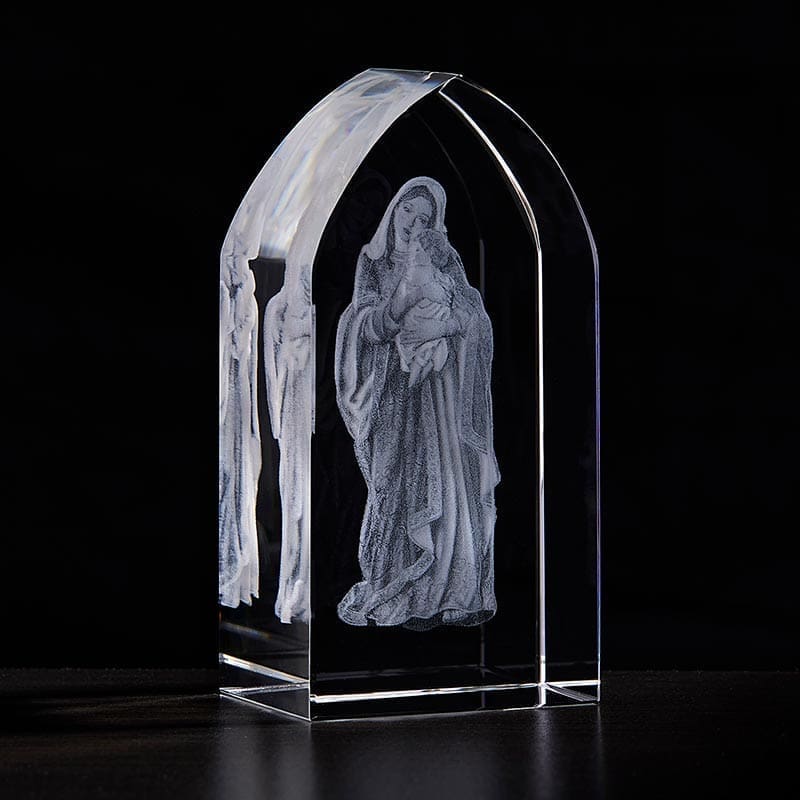 This Etched Glass Stand from Jeweled Cross features a 3D image of Madonna and Child in the center. The crystal clear look makes it a good home décor piece.