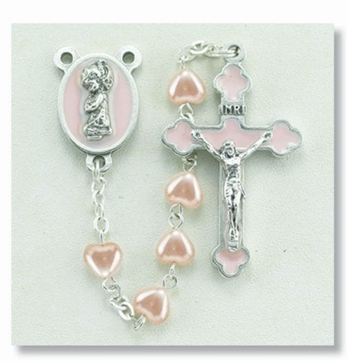 Pink Heart Shaped Rosary with Enameled Pink Girl Center. Boxed