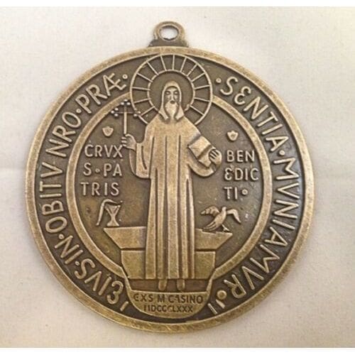 3 7/8" circumference includes a grommet for hanging. Back of medal shows reverse side of a Benedictine medal.