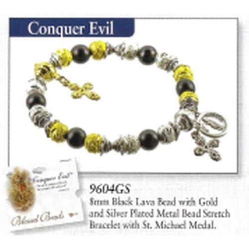 8 mm black Lava bead with gold and silver-plated metal beads stretch bracelet with St. Michael medal.