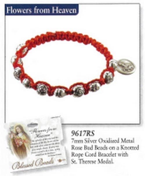 7mm Silver Oxidized Metal Rosebud Beads on a Knotted Rope Cord Bracelet with St. Therese Medal.