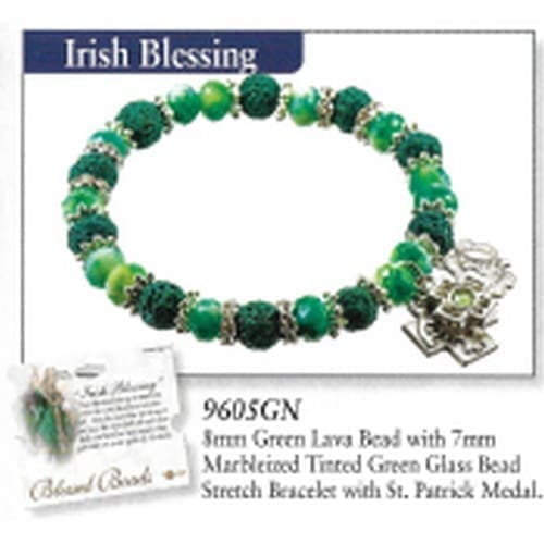 8mm Green Lava Bead with 7mm Marbleized Tinted Green Glass Bead Stretch Bracelet with St. Patrick Medal.