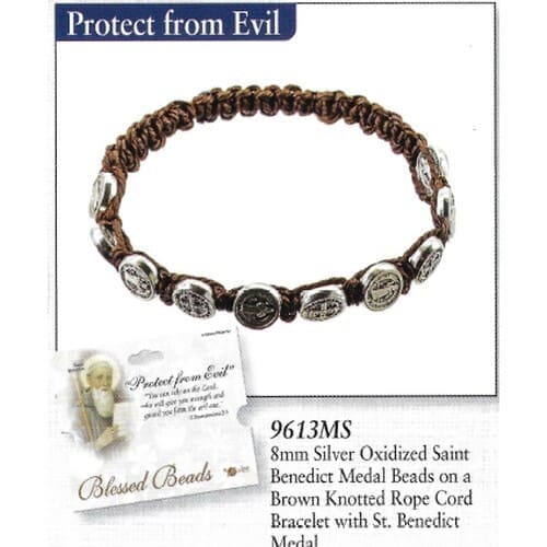 8mm Silver Oxidized St. Benedict Metal Beads on a Brown Knotted Rope Cord Bracelet with St. Benedict Medal.