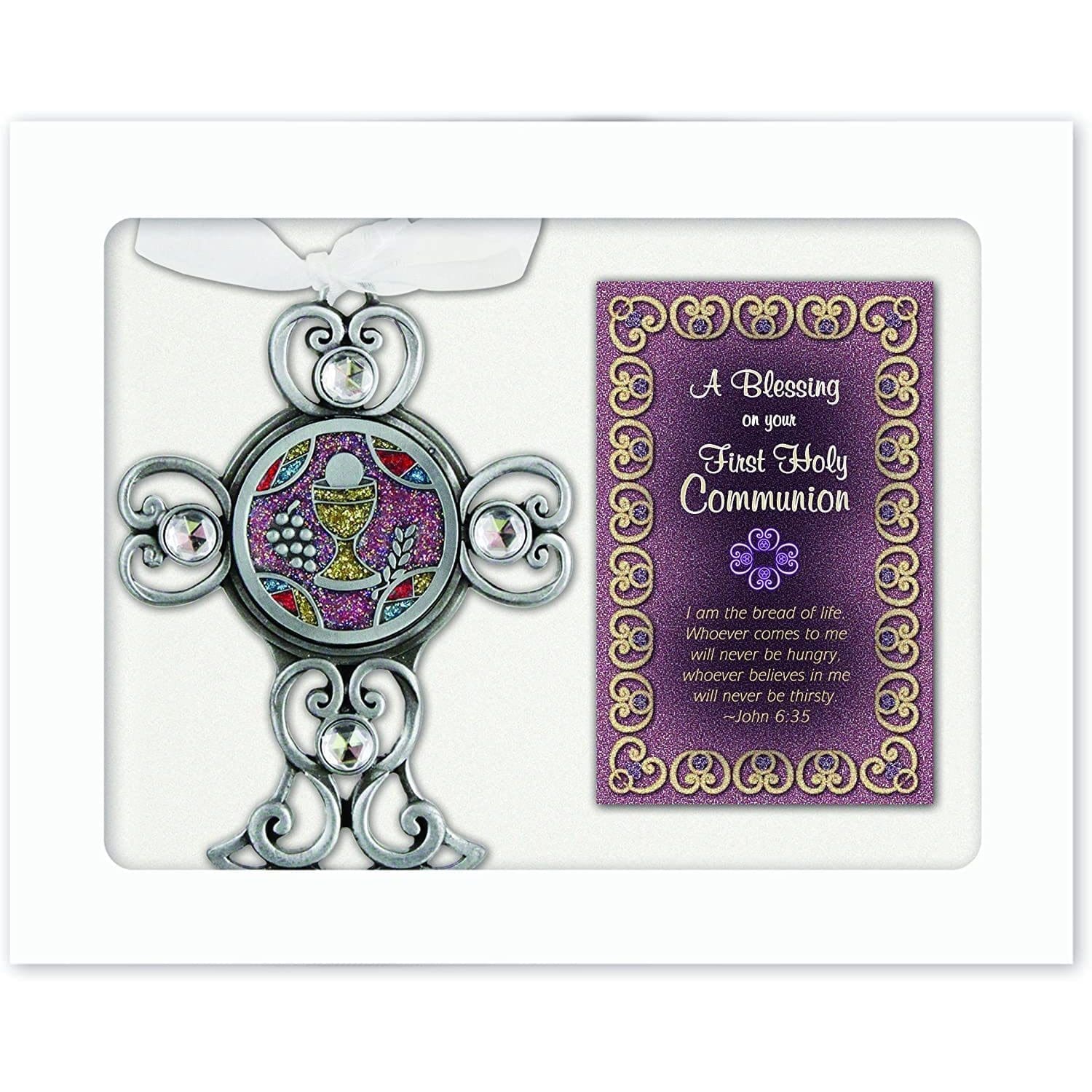 Bright, hand-polished finish with white ribbon for hanging. Gift boxed with holy communion blessing card.