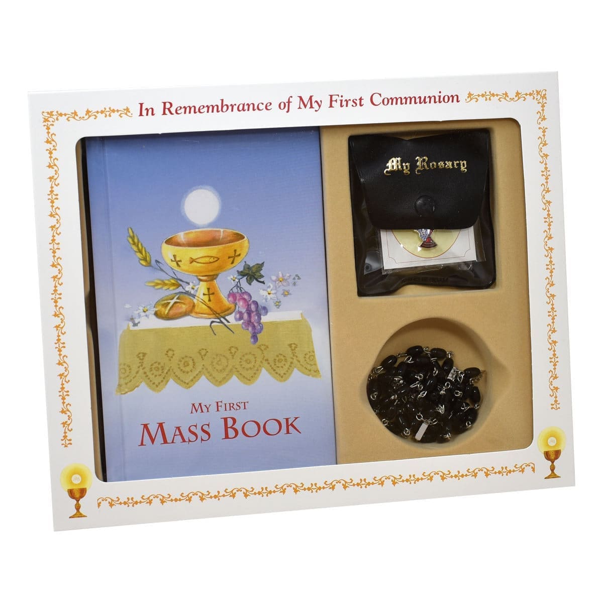 This Deluxe Boxed Set for boys contains a My First Eucharist Edition First Mass Book, deluxe chain rosary in a two-piece illustrated twist case with a Scripture verse, taper candle, and laminated bookmark.