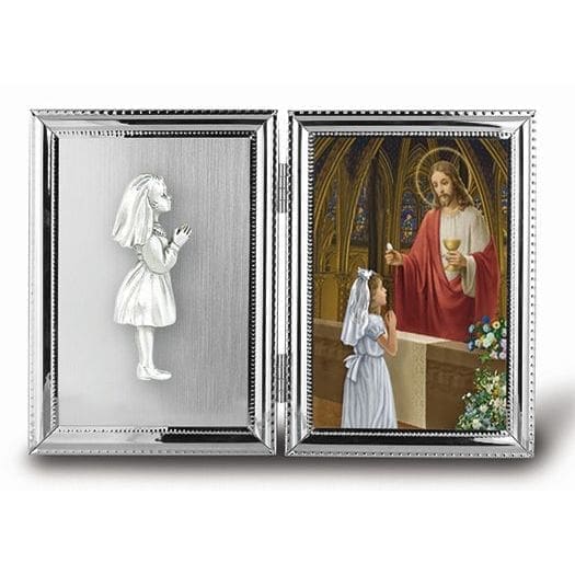 Double Hinged Remembrance Photo Frame. All Silver Plated Framework with Genuine Pewter Girl Figurine on Satin Metal Sheet.