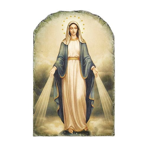 The Marco Sevelli Arched Plaque collection features this embossed relief tile plaque of the Our Lady of Grace icon. The muted tones painted on this plaque make it ideal for a special prayer corner in the home. Comes with a scrolled wire stand for tabletop use and a keyhole hanger for the wall. Gift boxed for easy storage or gift-giving.