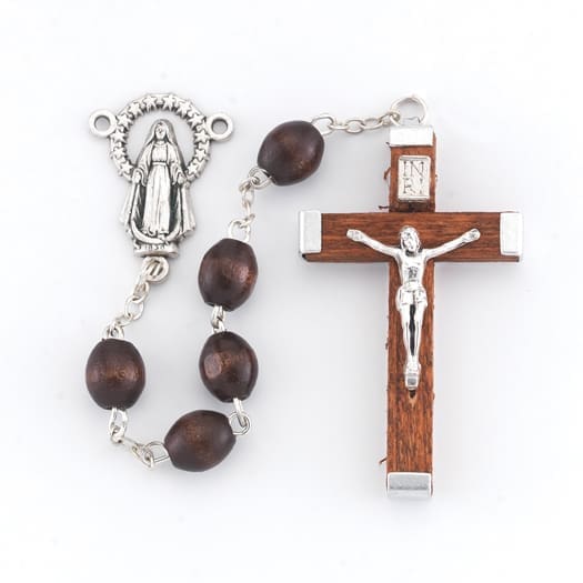 6x9mm Maroon Polished Oval Boxwood Beads with Silver Oxidized Center and Wood Crucifix. 17 1/2"