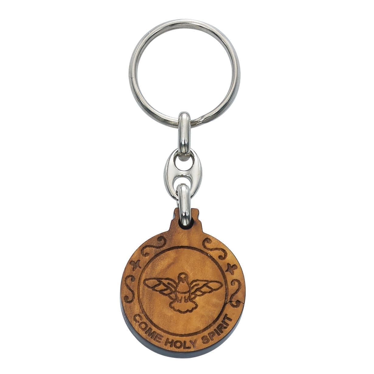 OLIVE WOOD HOLY SPIRIT KEY RING WITH SEVEN GIFTS ON THE BACK, MADE IN ITALY, DIMENSION: 1 1/4′ DIAMETER