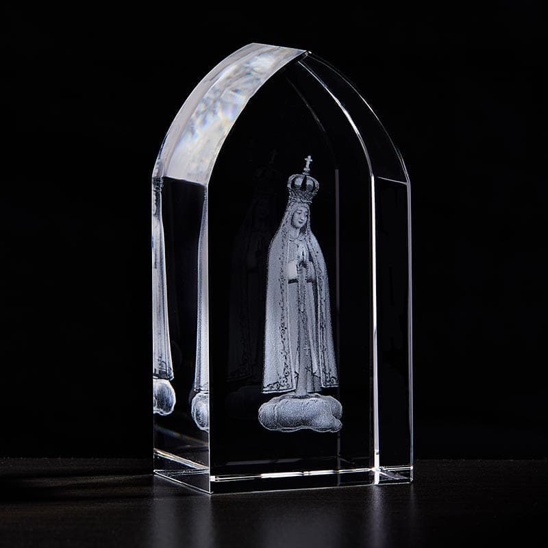 This Etched Glass Stand from Jeweled Cross features a 3D image of Our Lady of Fatima in the center. The crystal clear look makes it a good home décor piece.
