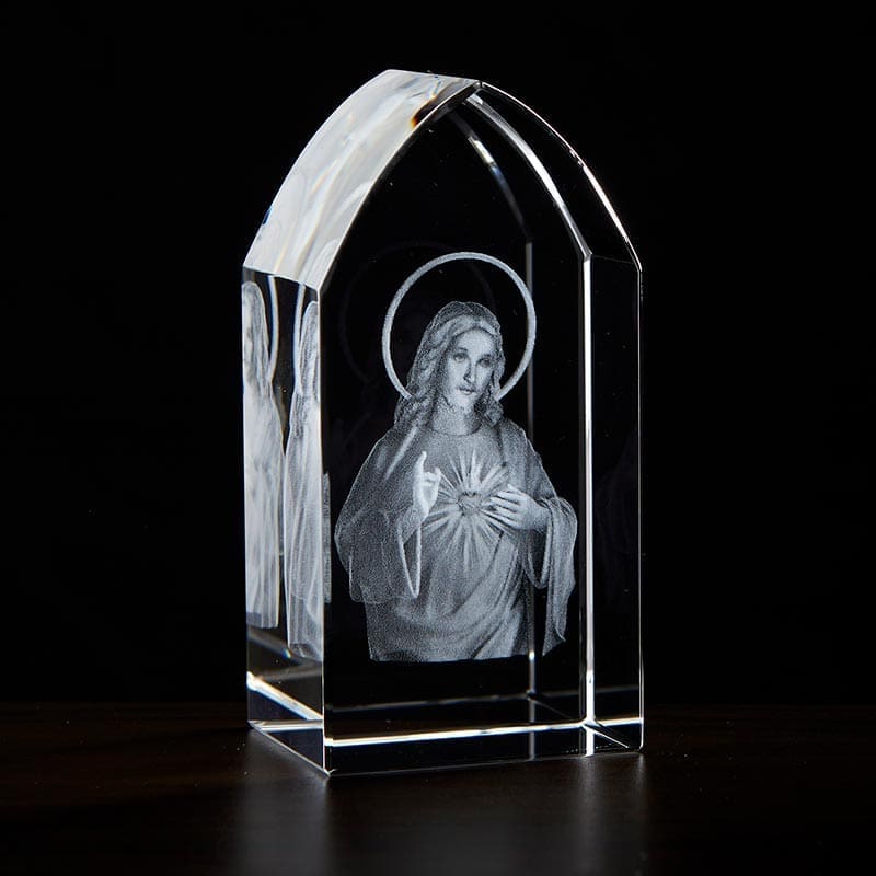 This Etched Glass Stand from Jeweled Cross features a 3D image of Sacred Heart in the center.