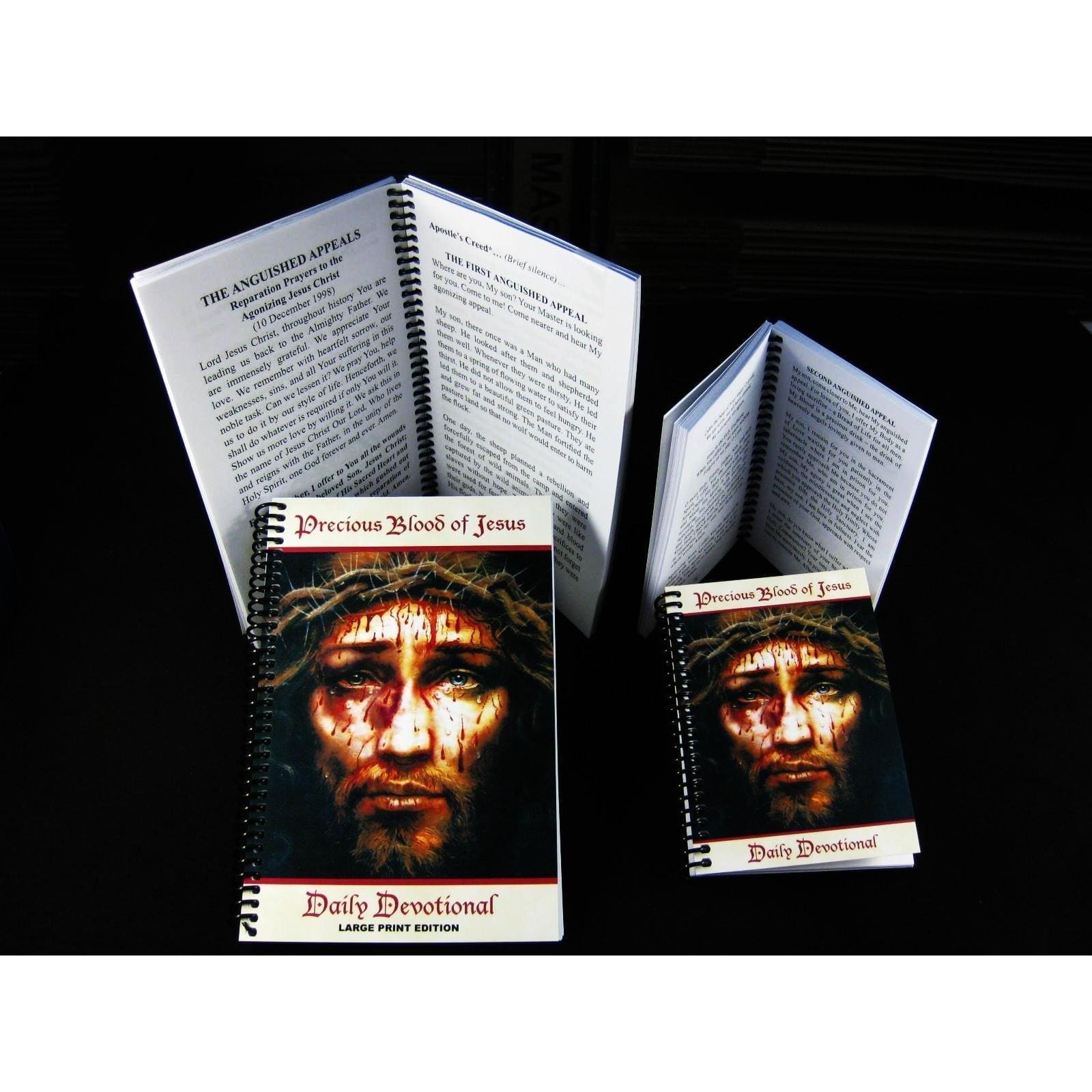 This book measures 8 1/2" x 5 1/2," has 160 pages and has a wire binding so it lays flat when open. Page for page it is exactly the same as the pocket sized book only twice as big. It is real easy on the eyes. All our prayer books, regardless of language, have all the same prayers on the same pages so even a multi-lingual group can easily pray this devotion together.