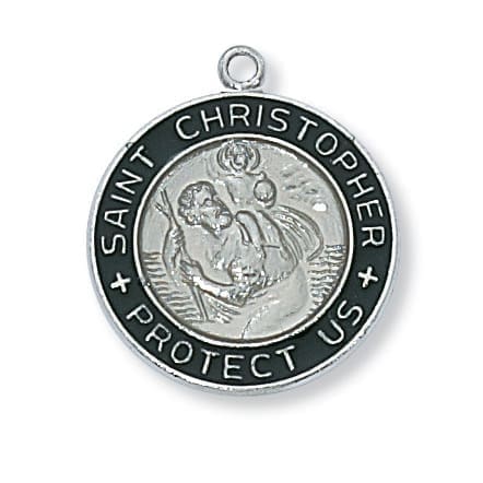 STERLING SILVER ST. CHRISTOPHE WITH BLACK & GREY ENAMEL 18″ RHODIUM PLATED CHAIN DELUXE GIFT BOX INCLUDED