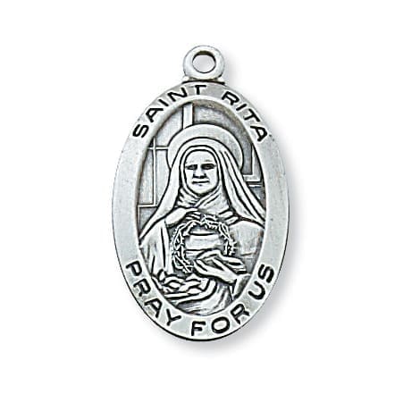 STERLING SILVER ST RITA PATRON SIANT OF HEALING WOUNDS ENGRAVABLE 18" RHODIUM PLATED CHAIN