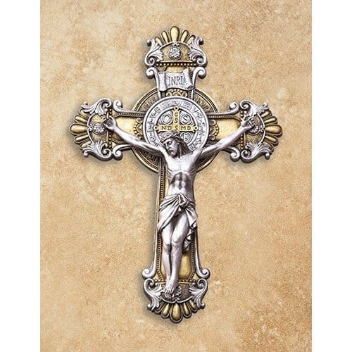 This St. Benedict crucifix is exclusively designed and exquisitely sculpted. Its ornate design features a medal containing symbols and text related to the life of Saint Benedict of Nursia. The medal is one of the oldest and most honored medals used by Christians and due to the belief in its power against evil is also known as the “devil-chasing medal.” The antique silver corpus and molding sit on an antique gold finish base. A great addition to your home or sacred space, the wall crucifix features the back of the medal and a keyhole for ease of hanging. Crucifix comes packed in an exquisite gift box and is ready for gift giving. — Antique Silver/Antique Gold Finish Resin — 10 1⁄4" H CB Catholic F4955 or LC329