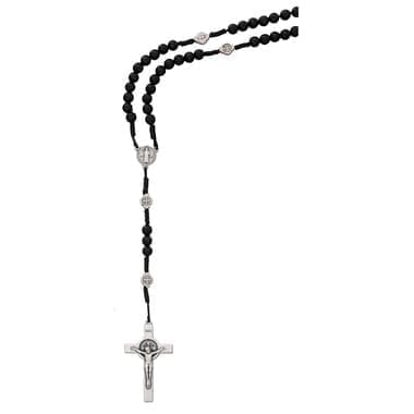 BLACK WOOD BEADS WITH SILVER OXIDIZED CRUCIFIX AND CENTER. SILVER OXIDIZED ST. BENEDICT OUR FATHER BEADS,