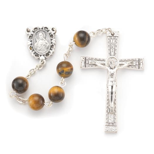 8mm Tiger Eye Genuine Round Stone Bead Rosary with Deluxe Center and Crucifix. 23" (Deluxe Velvet Box) HT 1108TE