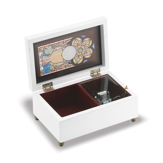 Our new line of stained glass music boxes will bring a smile to anyone's face. This Solid wood White Communion Music Box plays the sacred hymn 'Ave Maria'. Our Italian stained glass Chalice image is designed after the stained glass windows from church, and is a definite keepsake. Has two compartments to hold your favorite rosaries or jewelry.